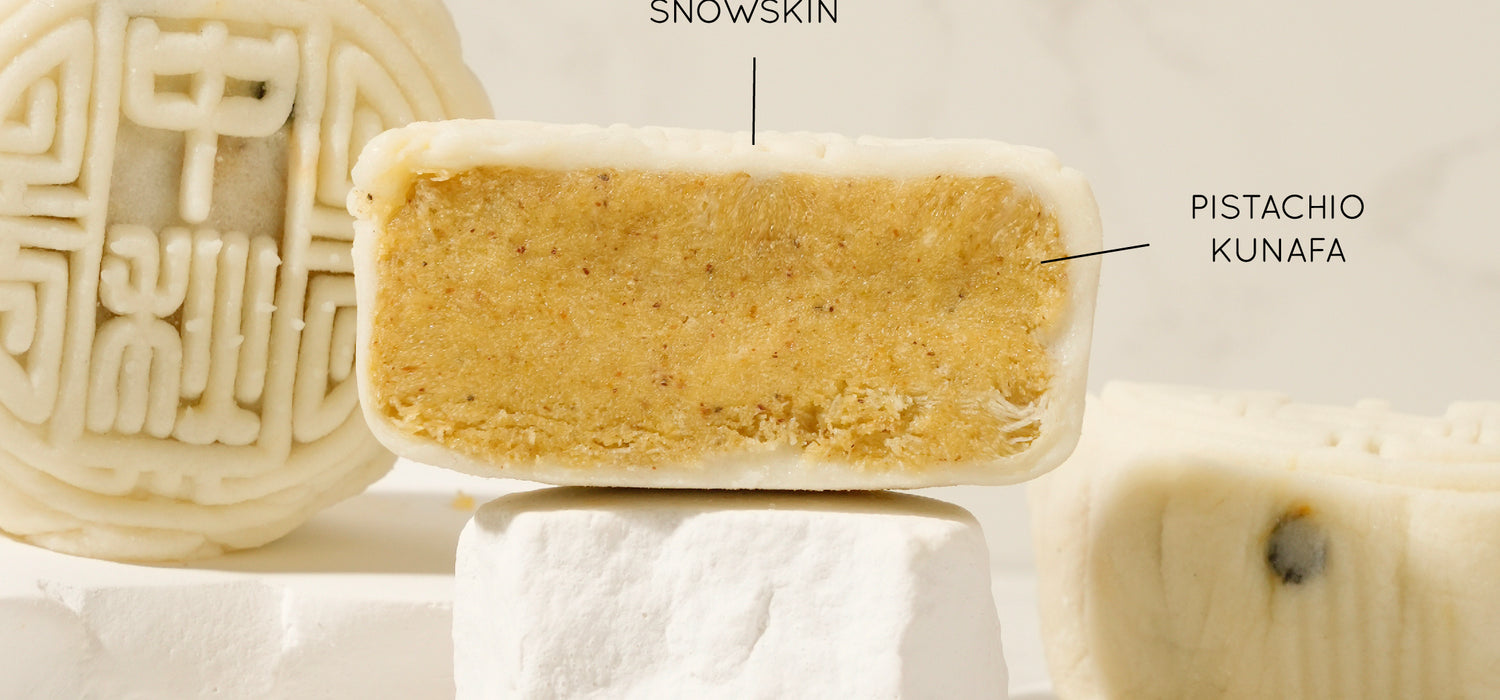 NEW — A decadent blend of creamy pistachio, crunch kunafa, wrapped in chewy, delicate snowskin with a burst of zesty passionfruit for a perfect balance of textures and flavours.